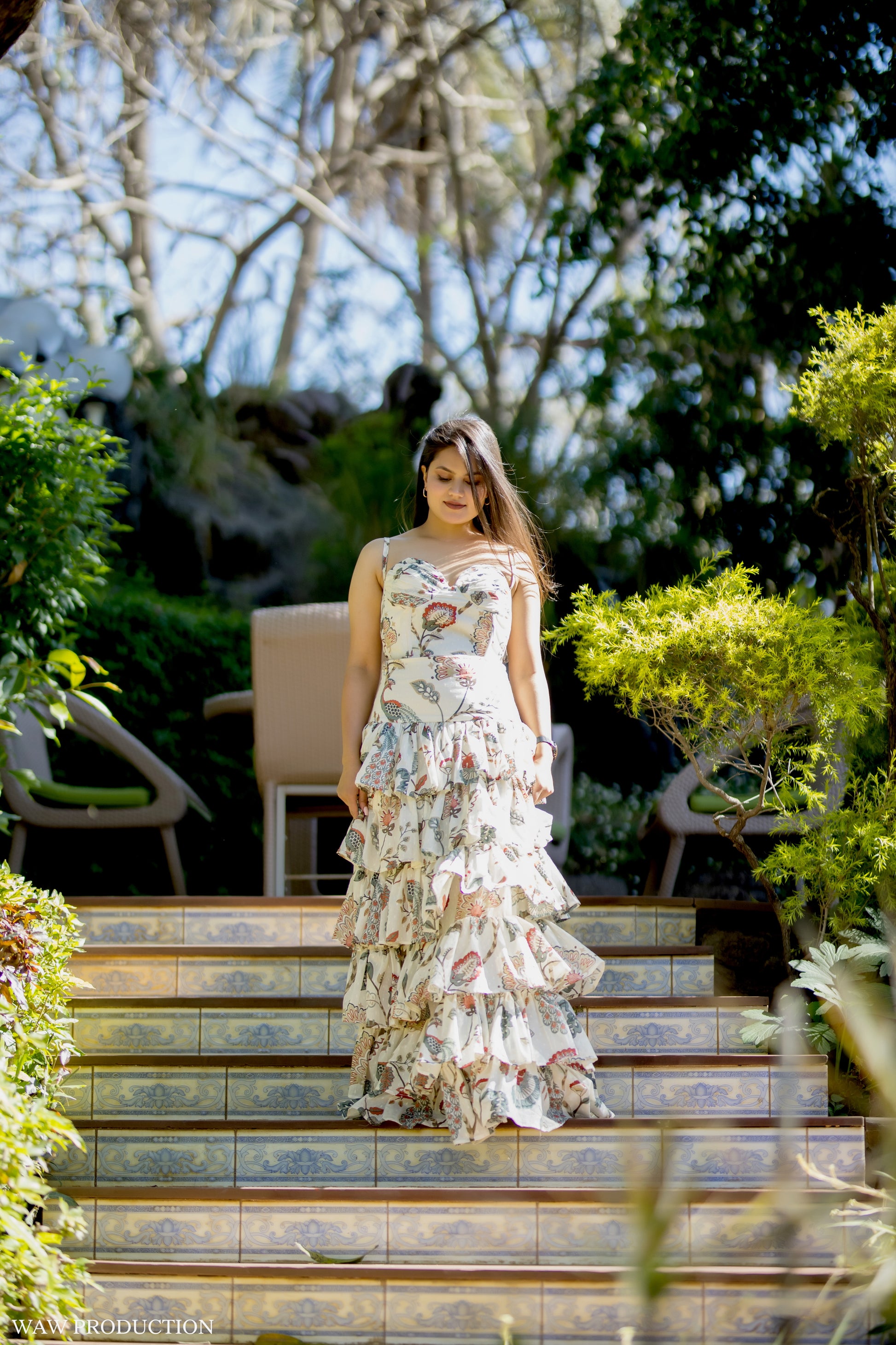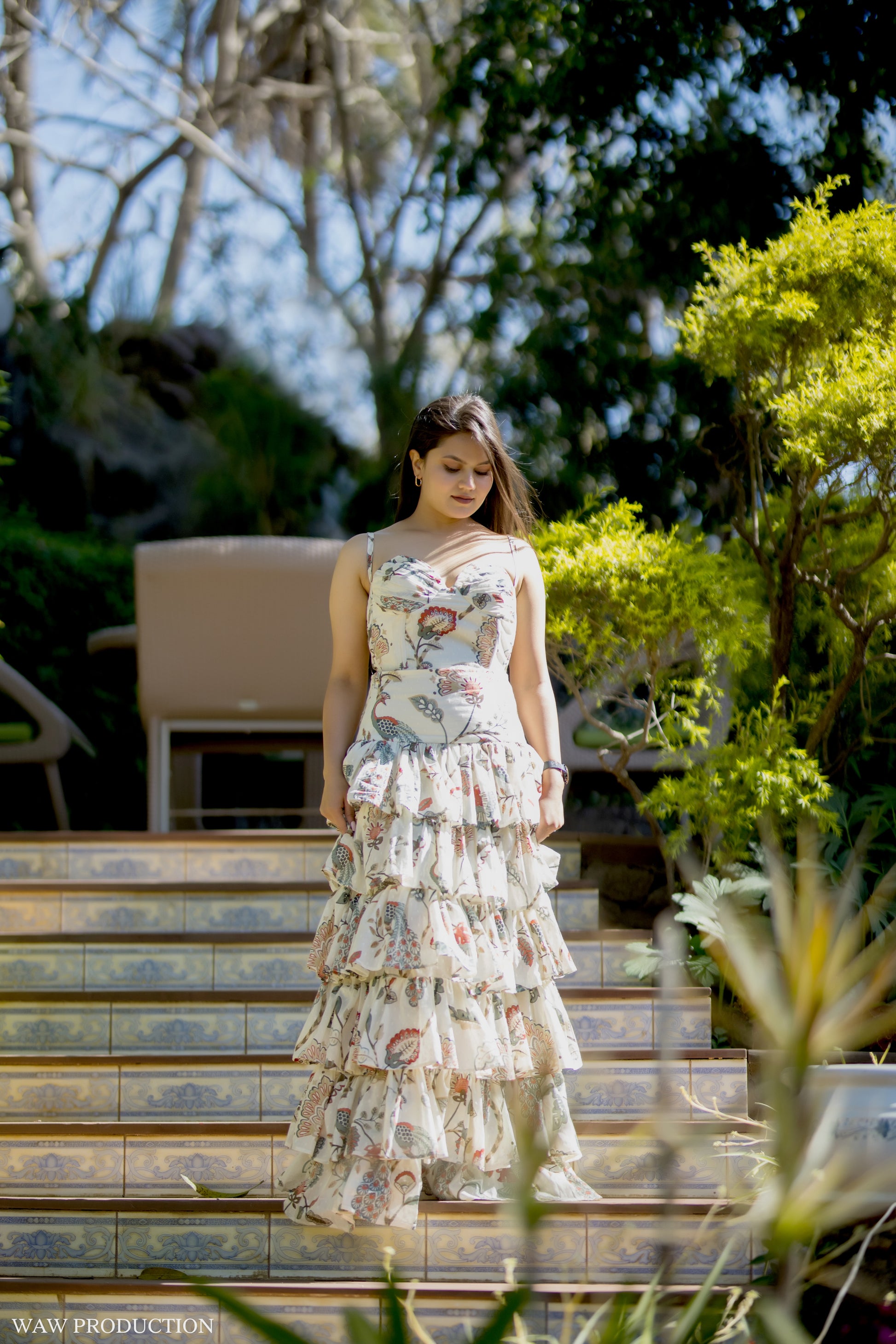 There's something undeniably effortless about a perfectly matched co-ord set. From beachside brunch to golden our drinks - our chic co-ord are your summer statements. This head turning piece features a pleated bustier top and layered frill skirt made in floral printed cotton fabric.