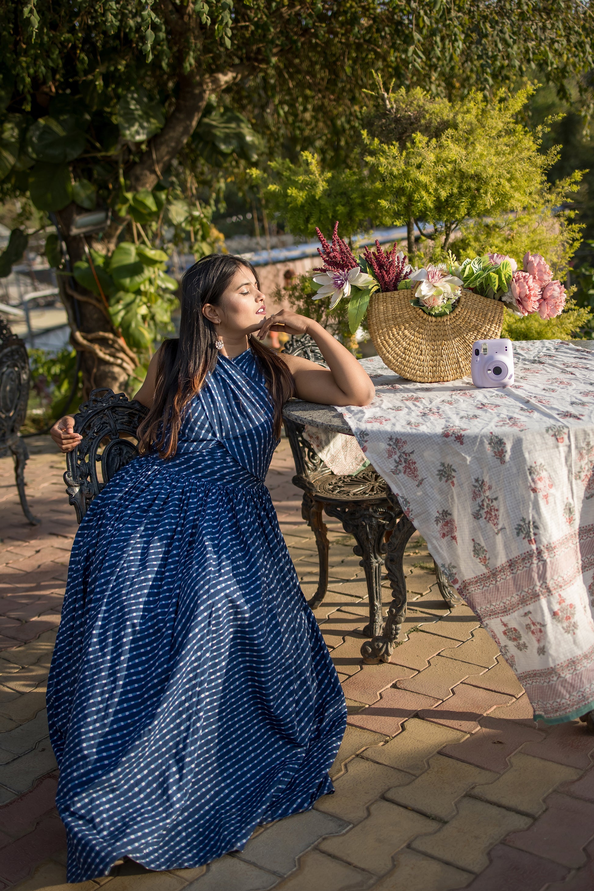 Elevate your elegance with our Stellar maxi dress in a serene shade of blue. Designed to make a statement, this dress features a graceful halter neckline that highlights the shoulders and collarbones, while the soft pleated detailing flows beautifully with every step. — perfect for summer soirées, sunset dinners, or destination celebrations. The floor-sweeping silhouette flatters every frame, making it a timeless addition to your wardrobe
