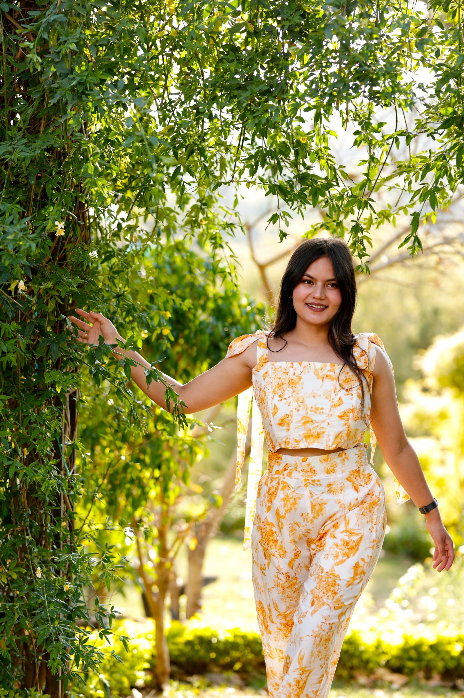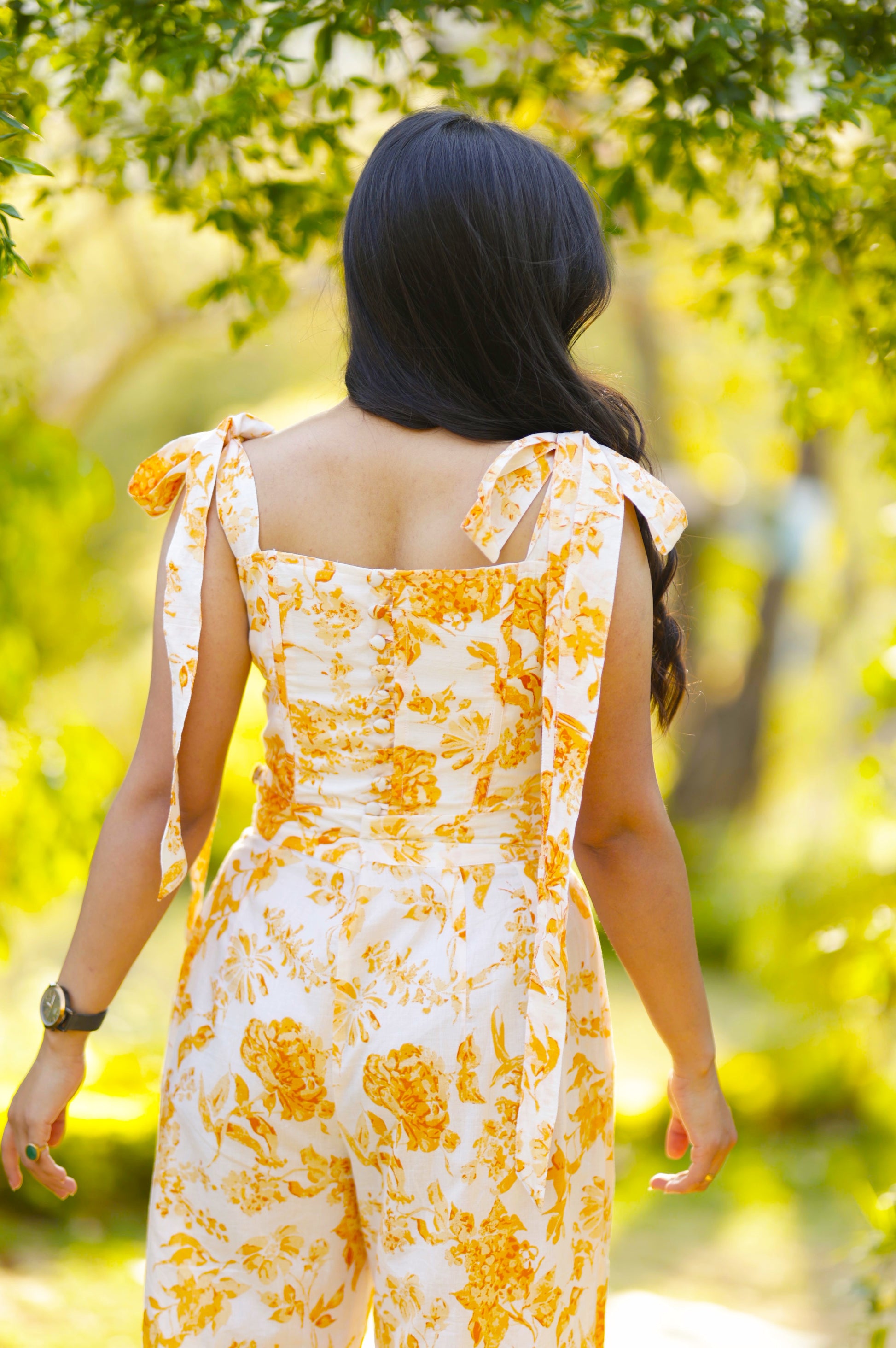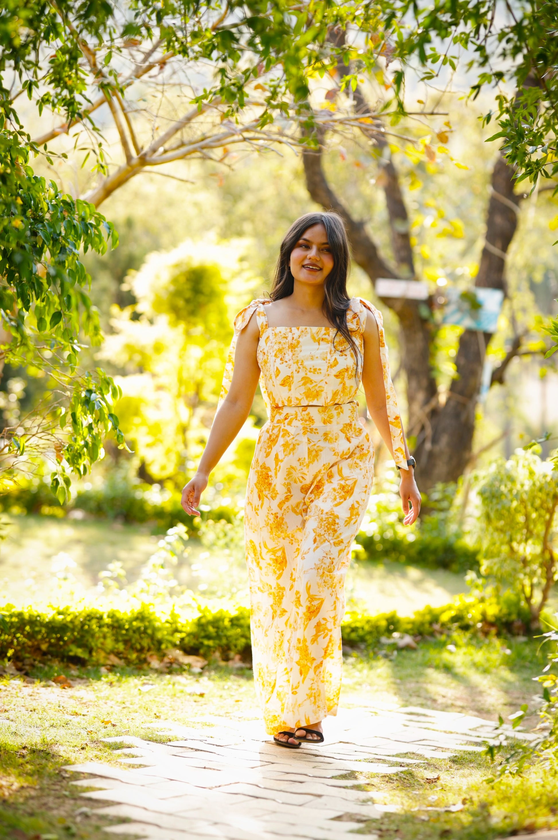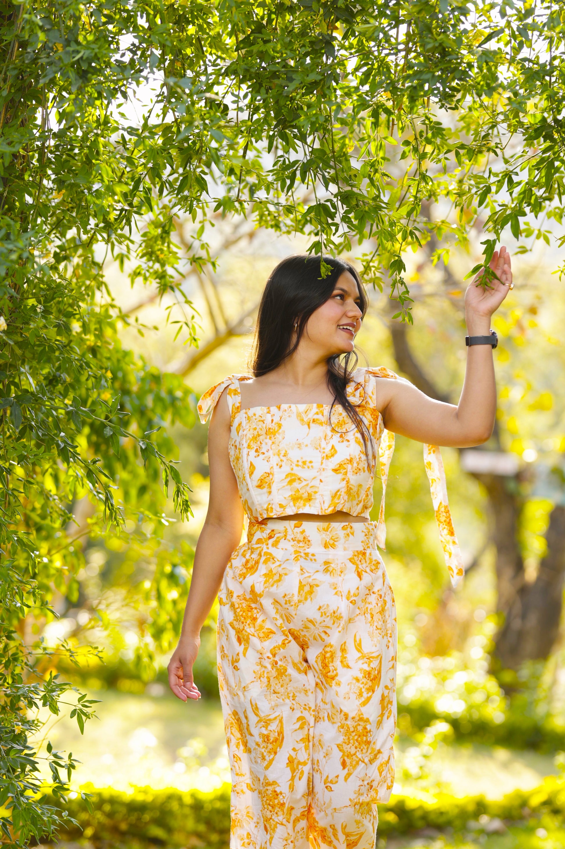 Brighten every moment in the soleil Set. Featuring a beautifully tailored corset top with feminine shoulder tie-ups and delicate button detailing at the back, this set blends comfort with statement style. Paired with matching wide-leg pants in a refreshing yellow floral print over white, this co-ord is made for sunny brunches, vacations, and moments you want to shine a little brighter.